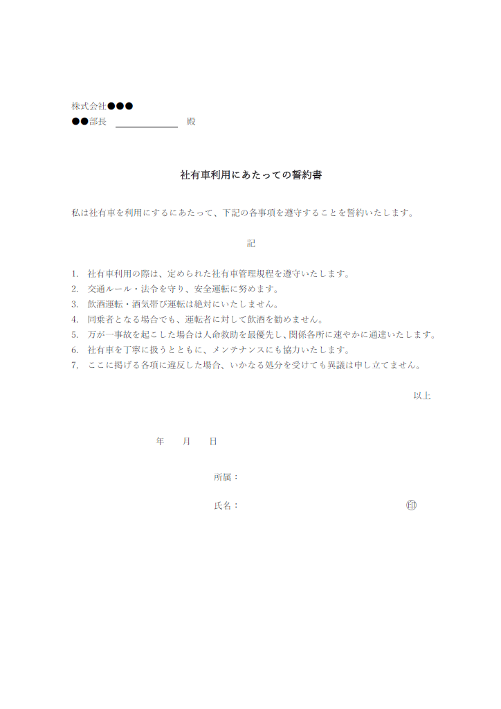 社有車を利用する際の誓約書のテンプレートとしてお使いいただけます。