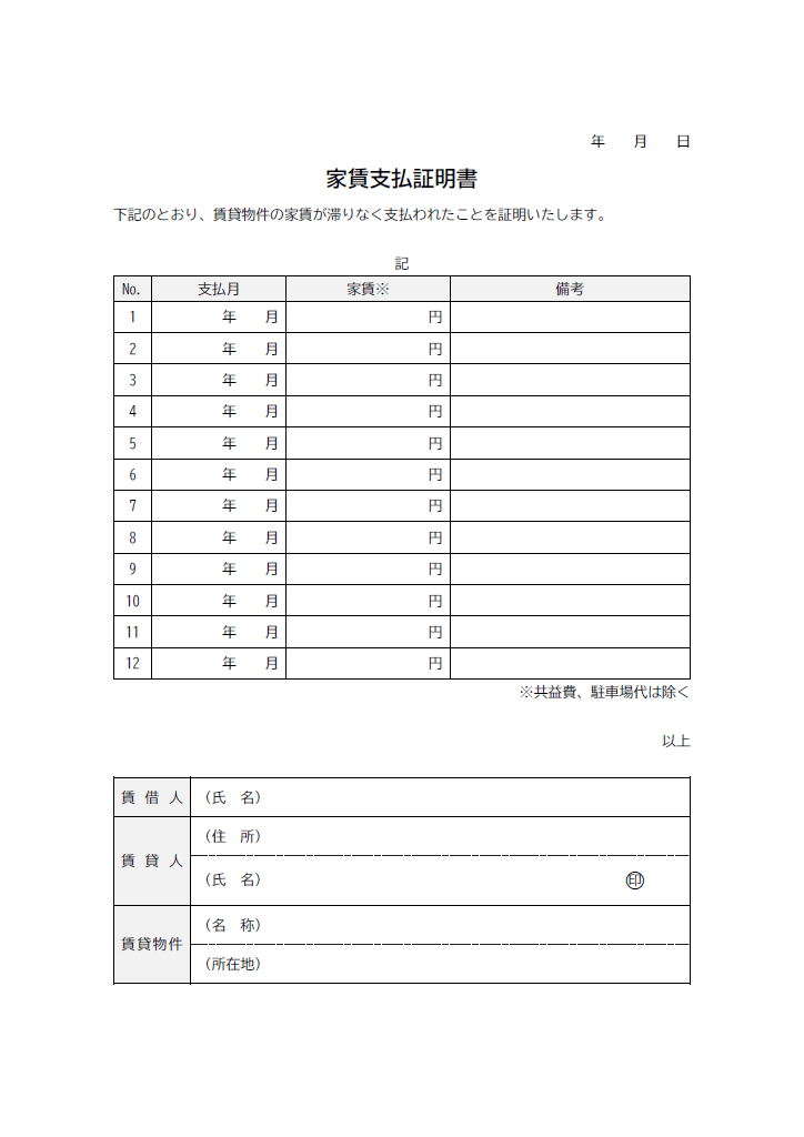12か月(1年間)の家賃支払いの証明書テンプレートとしてお使いいただけます。